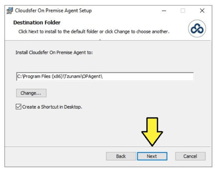 - Run the application. A pop-up window titled Cloudsfer On-Premises Agent Setup will appear. Click Next to continue.